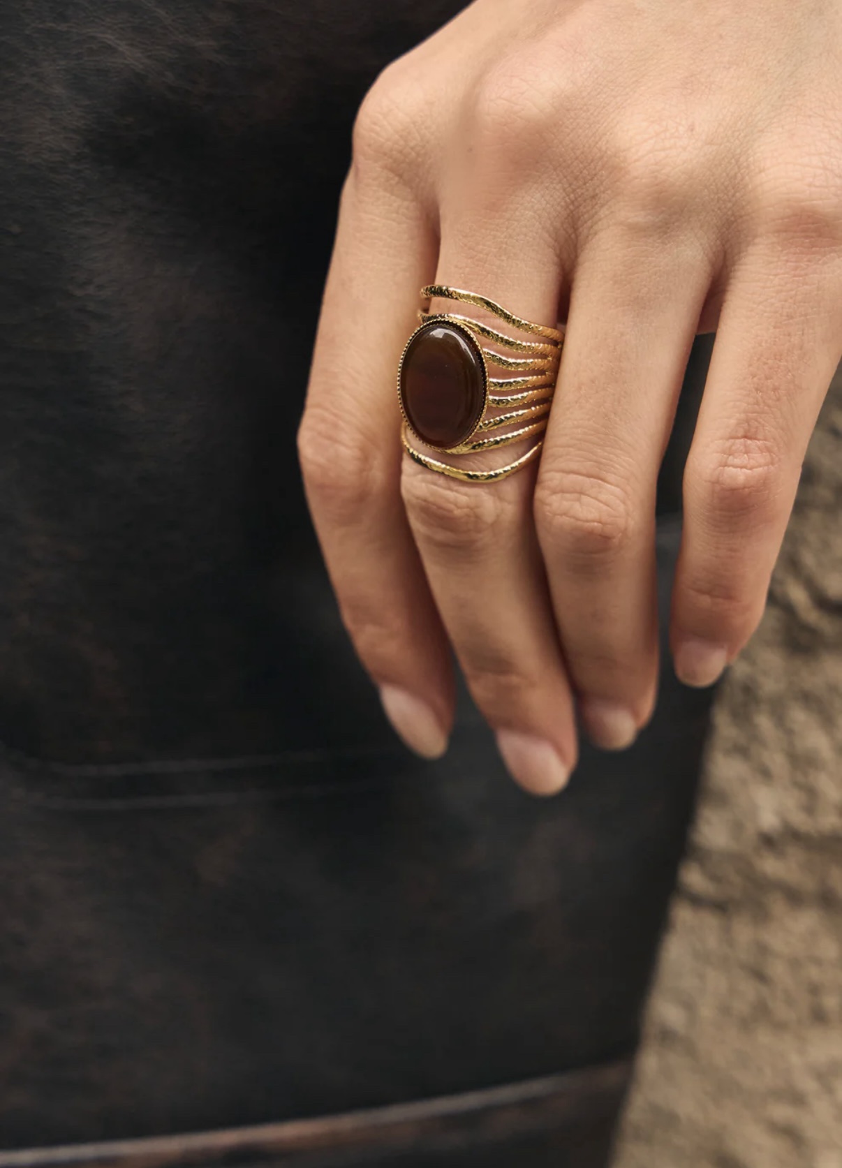 Bague dorée ajustable 8 branches martelées pierre centrale marron.