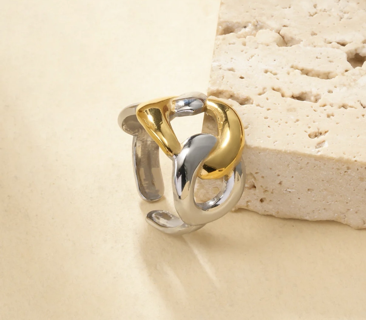 Bague bicolore argentée et dorée chaîne finition miroir.