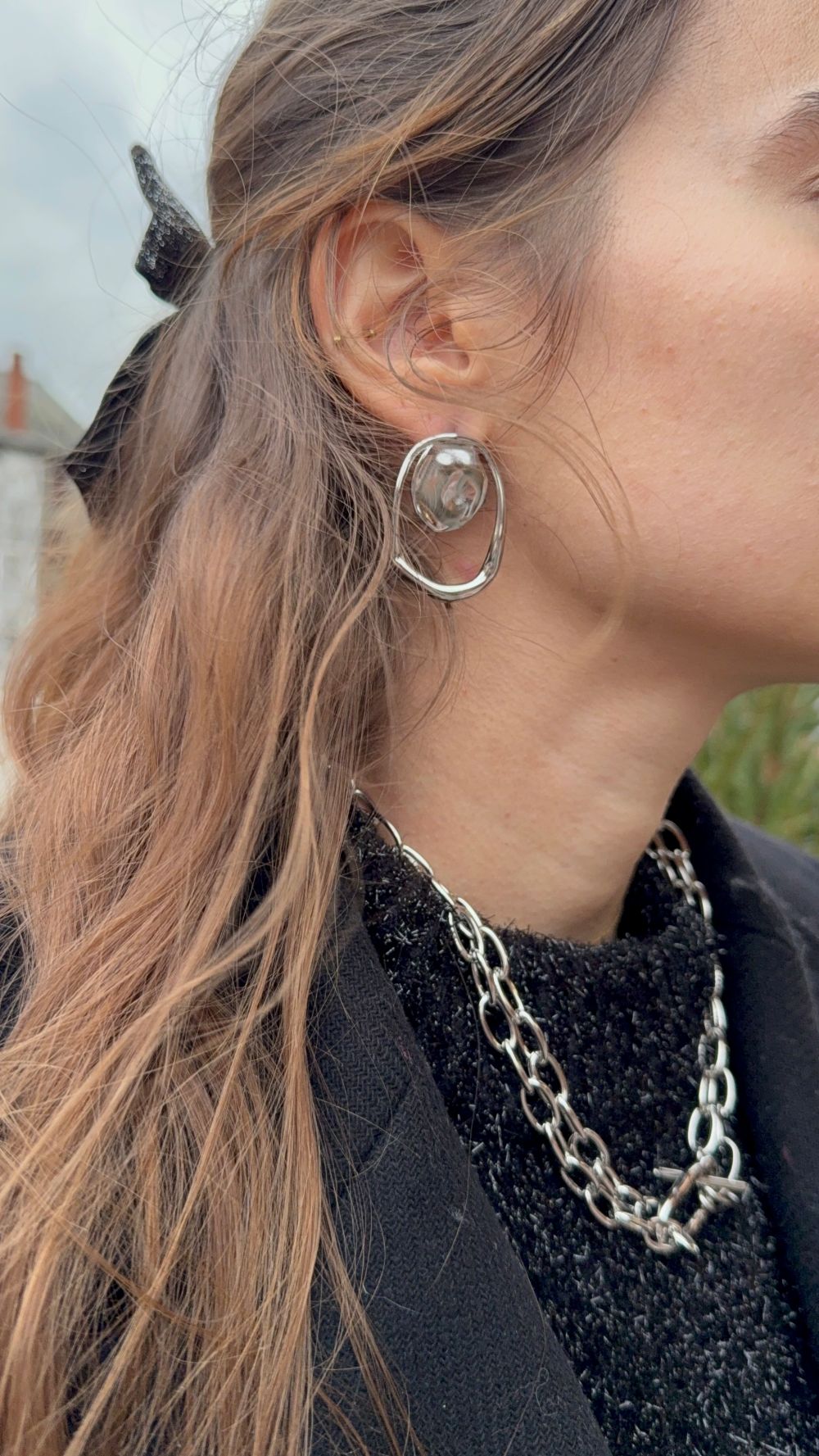 Boucles d’oreilles argentées géométriques cercle martelé et anneau irrégulier effet miroir.