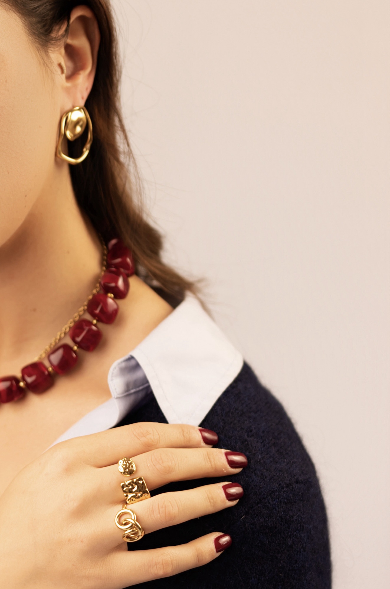 Boucles d’oreilles dorées géométriques cercle martelé et anneau irrégulier effet miroir.