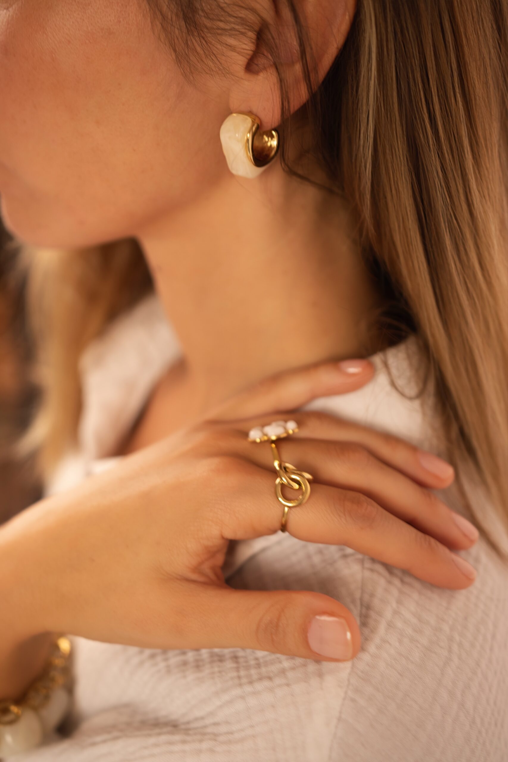 Boucles d’oreilles dorées anneaux carré résine ivoire marbrées.