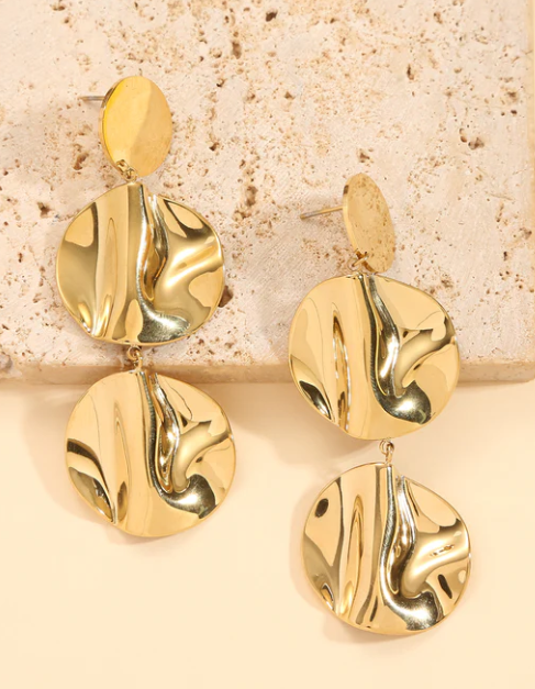 Boucles d’Oreilles Dorées Triple Disques Brillants Lisse Et Ondulés. Tous nos produits sont fabriqués en acier inoxydable, un matériel qui résiste à l’eau et au temps.
