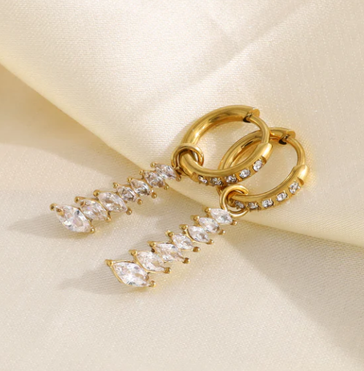 Boucles d’oreilles dorées mini créoles strassées pendant 7 losanges strassés alignés. Tous nos produits sont fabriqués en acier inoxydable, un matériel qui résiste à l’eau et ne se rouille pas dans le temps. Ils sont garantis sans nickel, sans cadmium et sans sel de plomb.