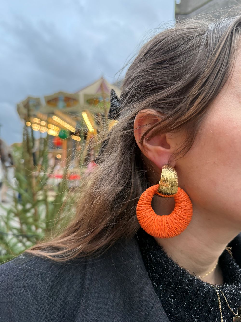 Boucles d’oreilles pendantes composées d’un anneau recourbé texturé en acier inoxydable et d’une pièce pendante recouverte de raphia synthétique. Dimensions de la boucle : 5 x 7 cmGarantie sans nickel, sans cadmium, sans sel de plomb. L’acier inoxydable résiste à l’eau et ne noircit pas.