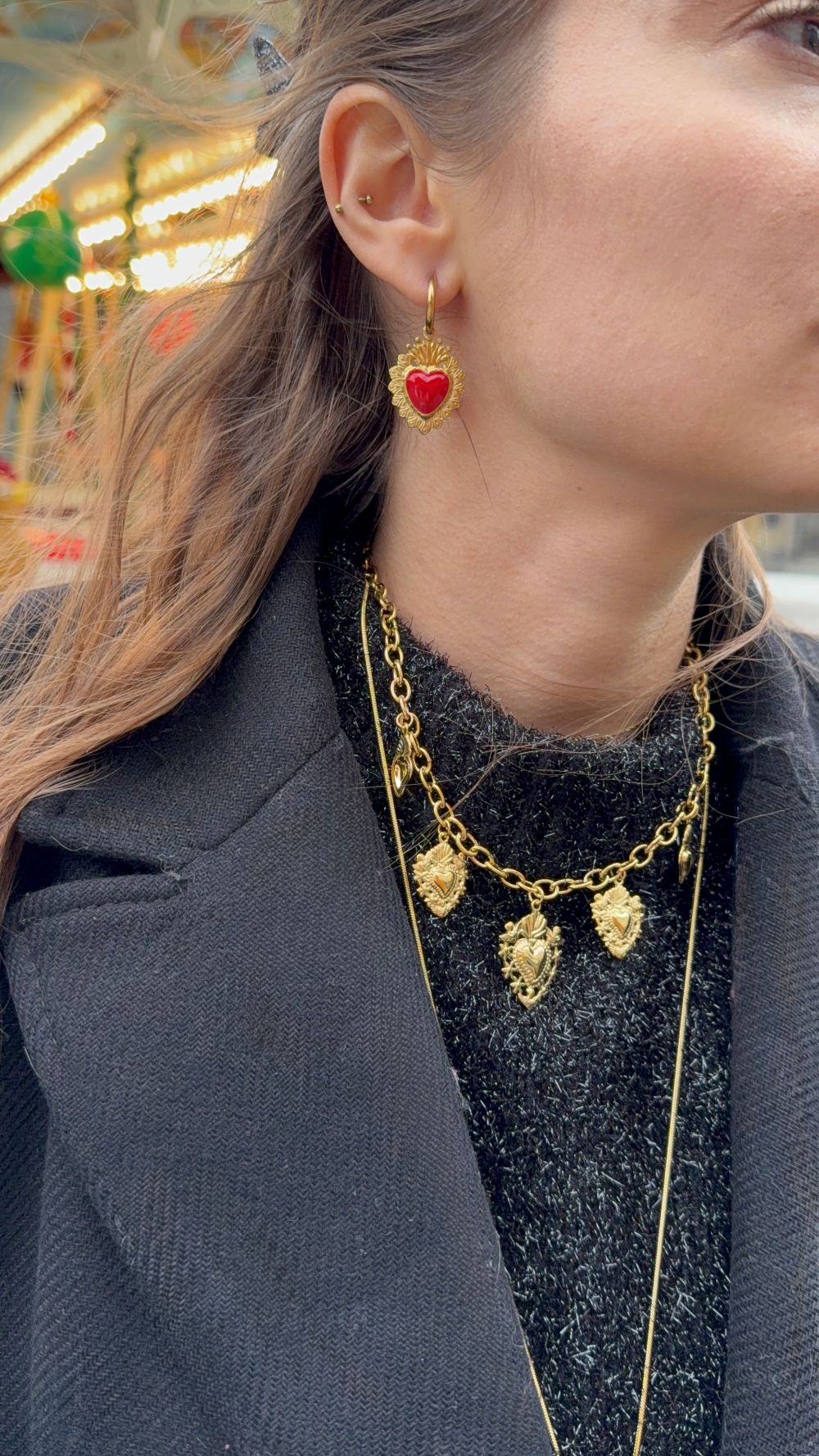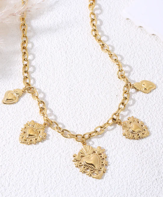 Collier doré avec breloques cœurs ex-voto. Tous nos produits sont fabriqués en acier inoxydable, un matériel qui résiste à l’eau et ne se rouille pas dans le temps. Ils sont garantis sans nickel, sans cadmium et sans sel de plomb.