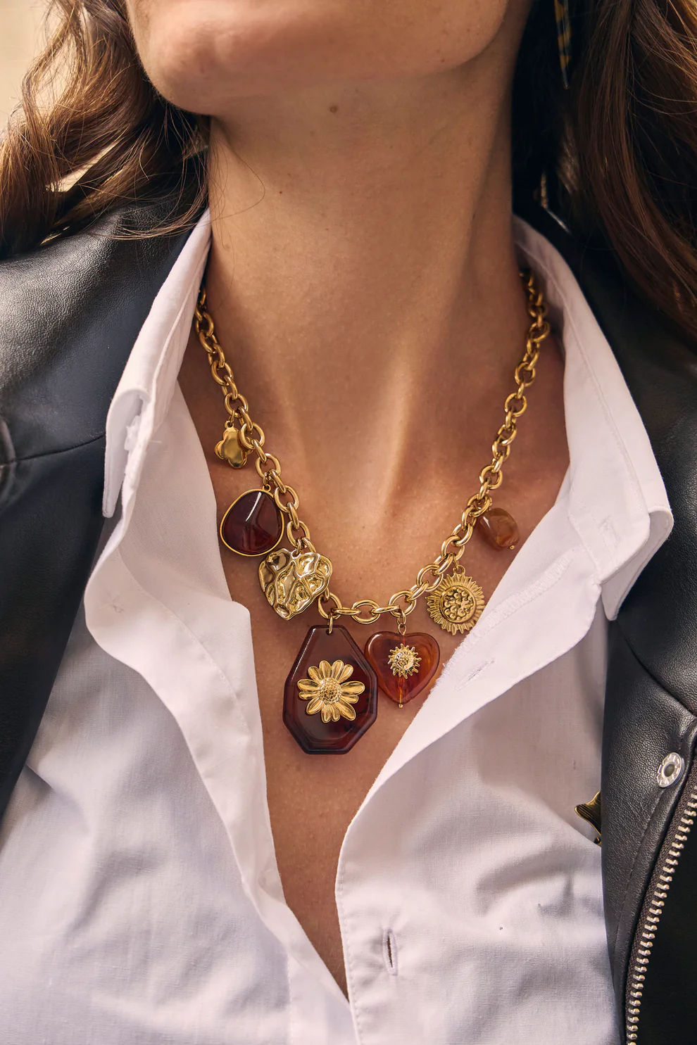 Collier chaîne dorée pendentifs doré et résine ambre motif fleur et cœur.