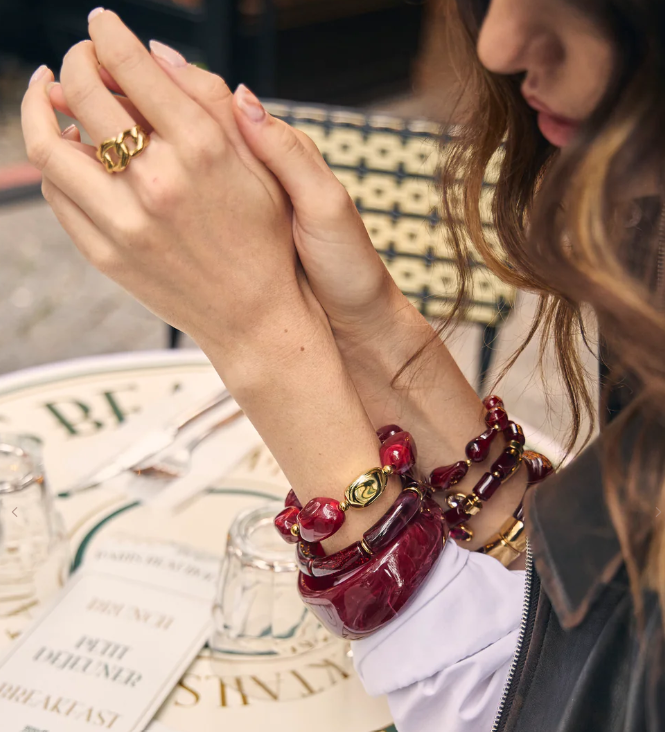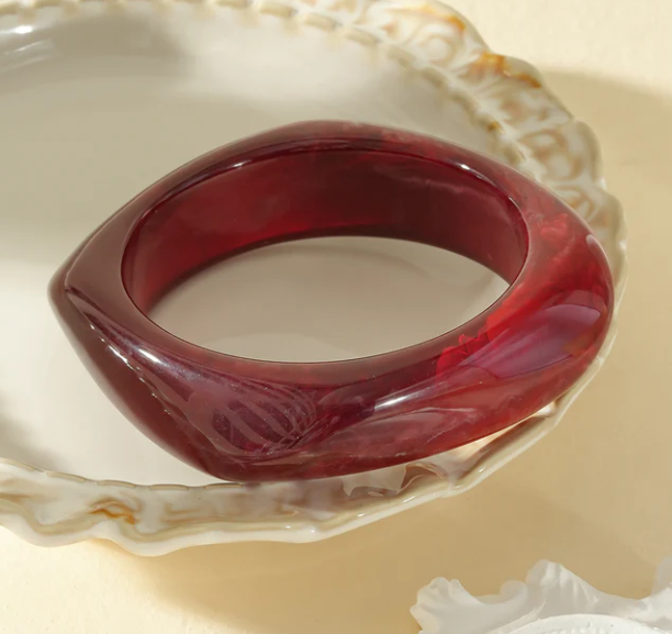 Bracelet jonc semi-épais rouge carmin marbré forme carré arrondi résine.